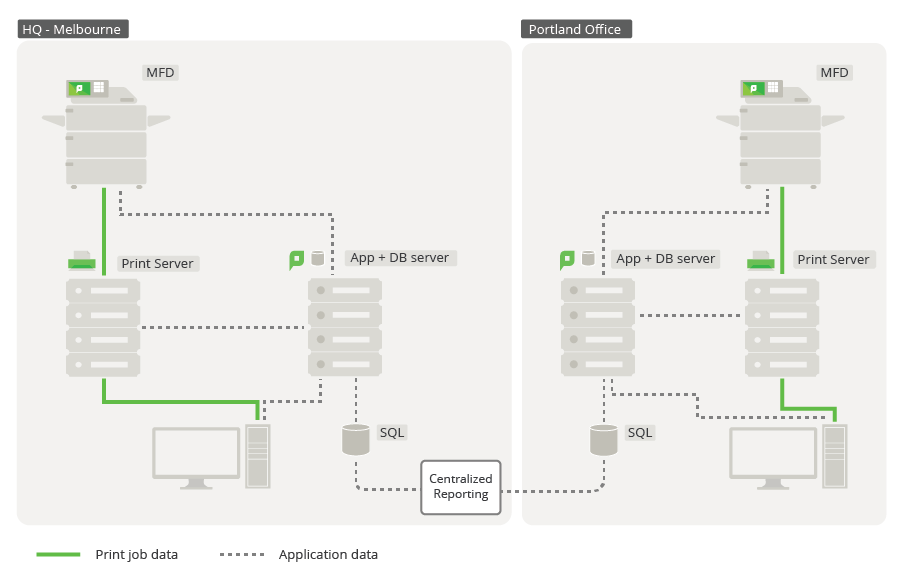 The PaperCut solution supports this design though the deployment of Configuring secondary print servers and locally attached printers on each of the print servers. This allows the print jobs to remain locally spooled, with only light-weight transactional data and control information being transmitted between sites.