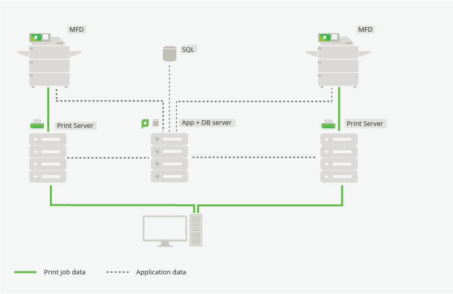 The PaperCut Site Server could add benefit in this deployment if each of the sites wanted to ensure key business services of MFD usage and Print Release were supported during a network outage between a site and Application Server.